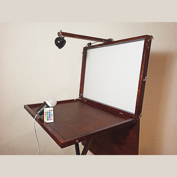 Incluye una luz no puntual (10w) con 16 colores a control remoto apta para el difuminado de varillas, una luz puntual (3w) con soporte para fijar en la parte superior del maletín apta para jugar con las proporciones de las sombras obteniendo sombras definidas en la distancia y un manual de uso.